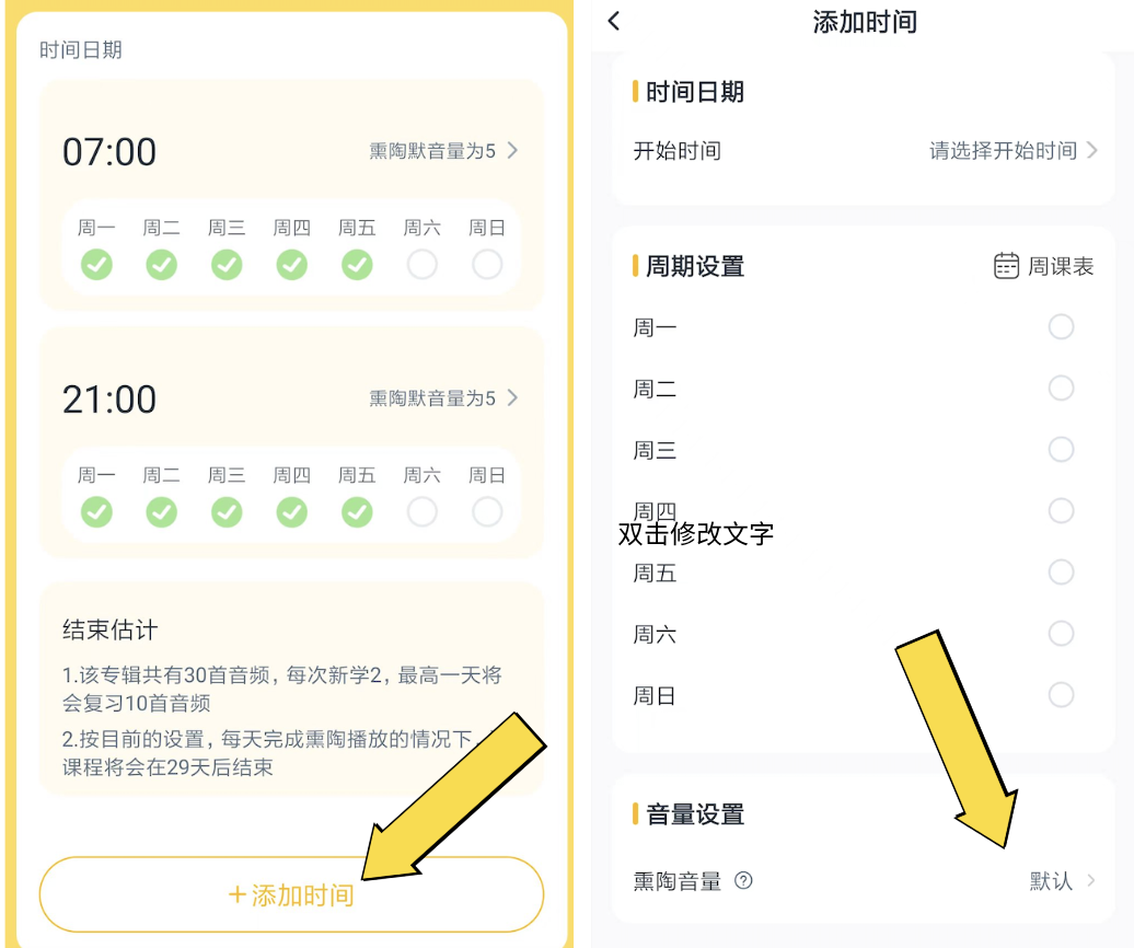 设置入口在“添加时间”这里,进入后可以设置周期和音量。