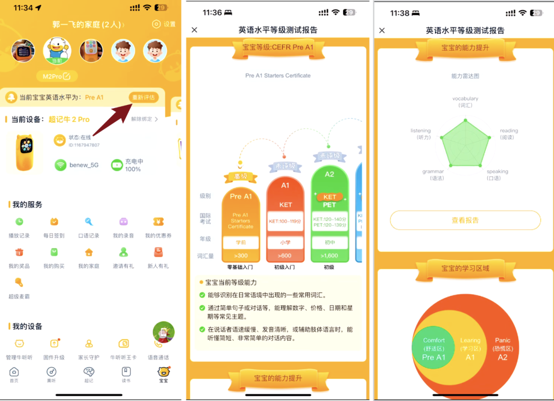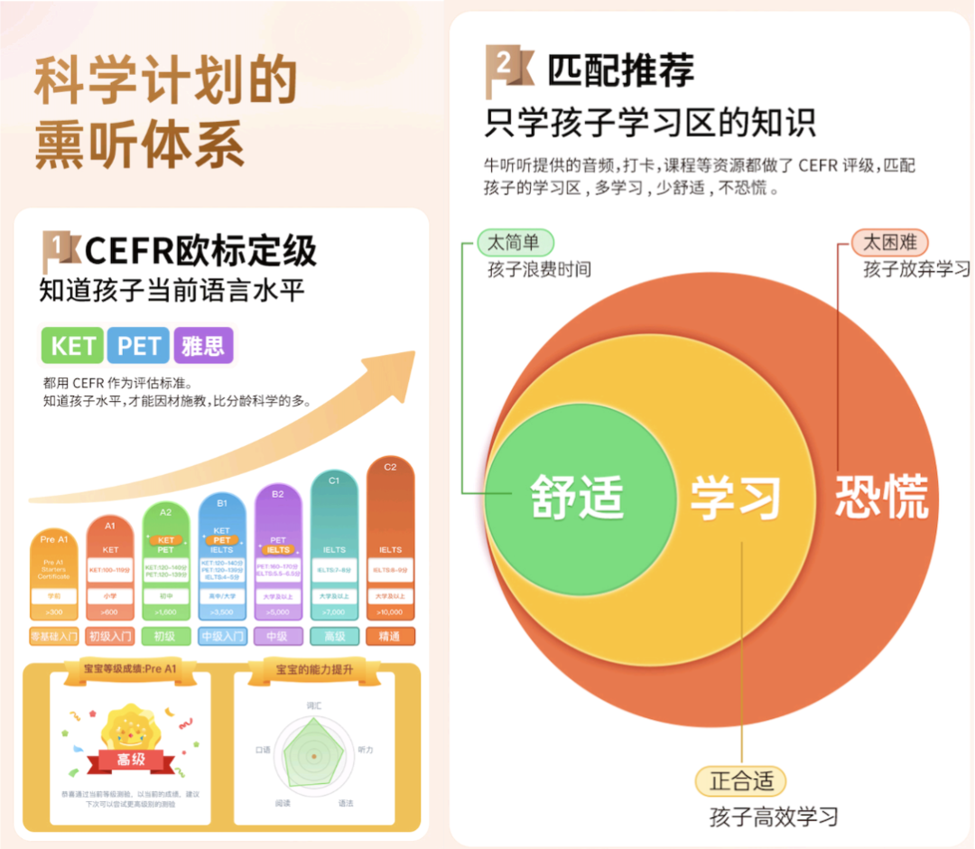 牛听听引入了CEFR欧标全套体系来评测孩子的英语能力水平。