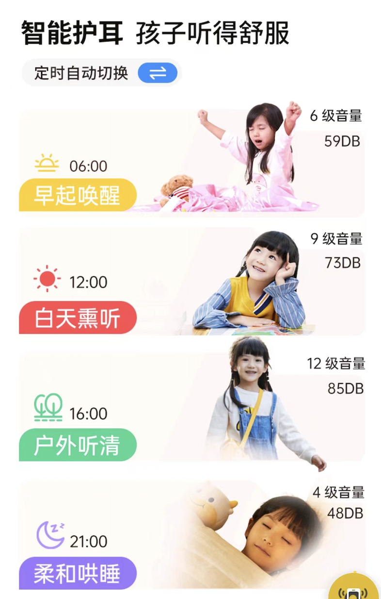 确保在一天当中的任意时间段孩子都以最适合的音量听到熏听的内容。