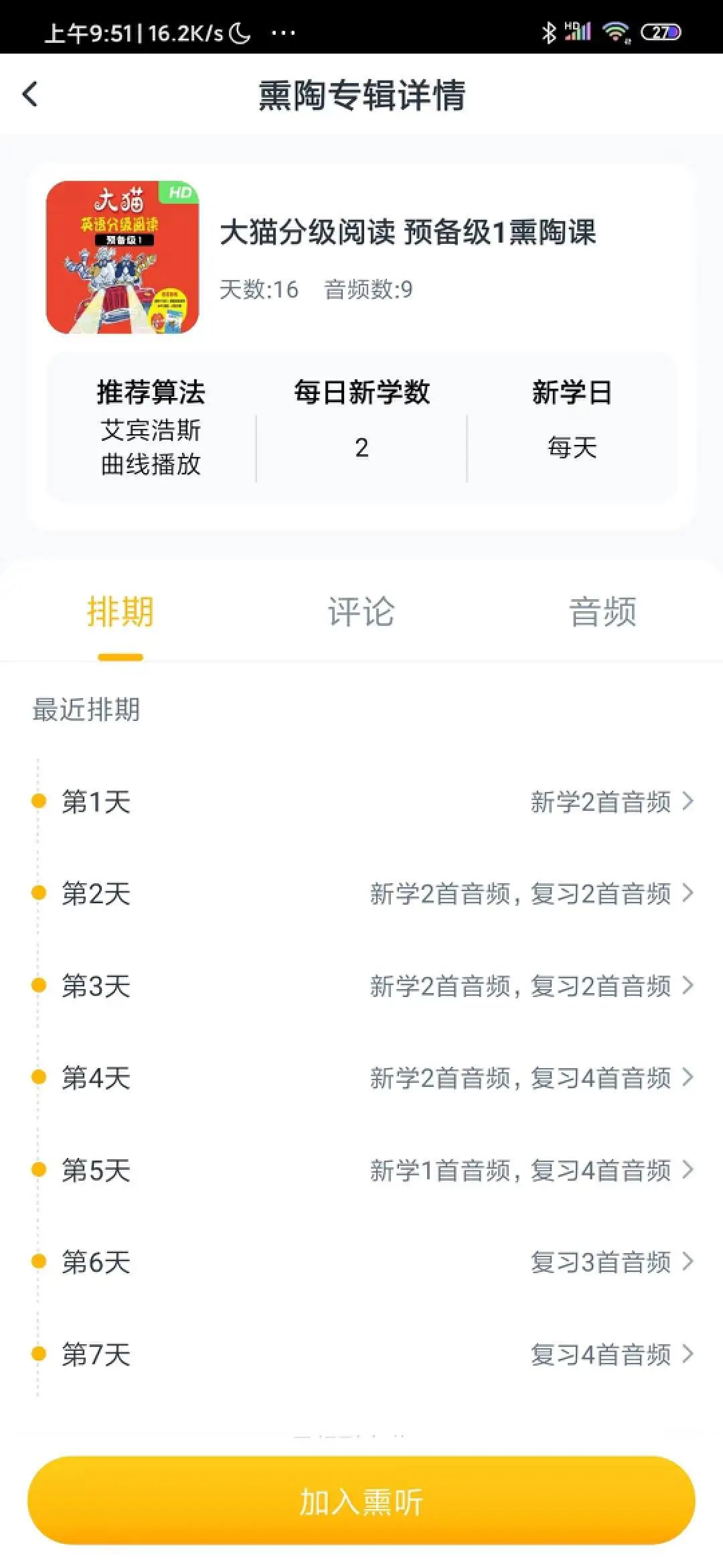 如果是分级阅读类的专辑,系统有固定算法,直接根据艾宾浩斯记忆曲线来播放熏听计划,不能自己随意调整。