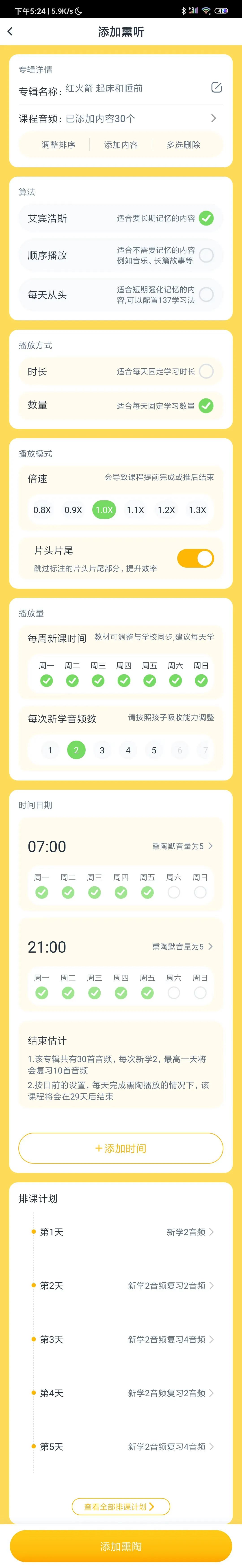 接下来就是完成这个熏听计划的设置,完成一次设置,就可以每天自动安排磨耳朵!