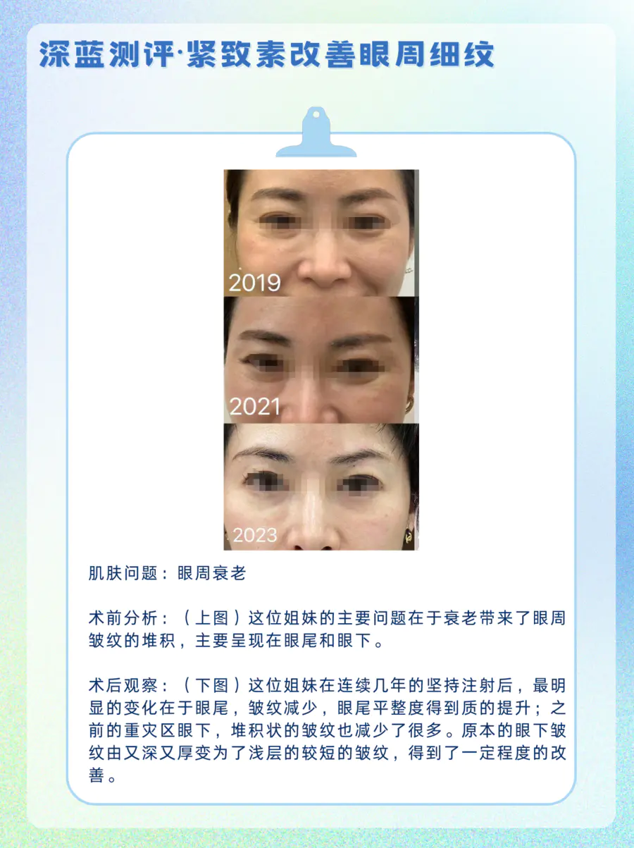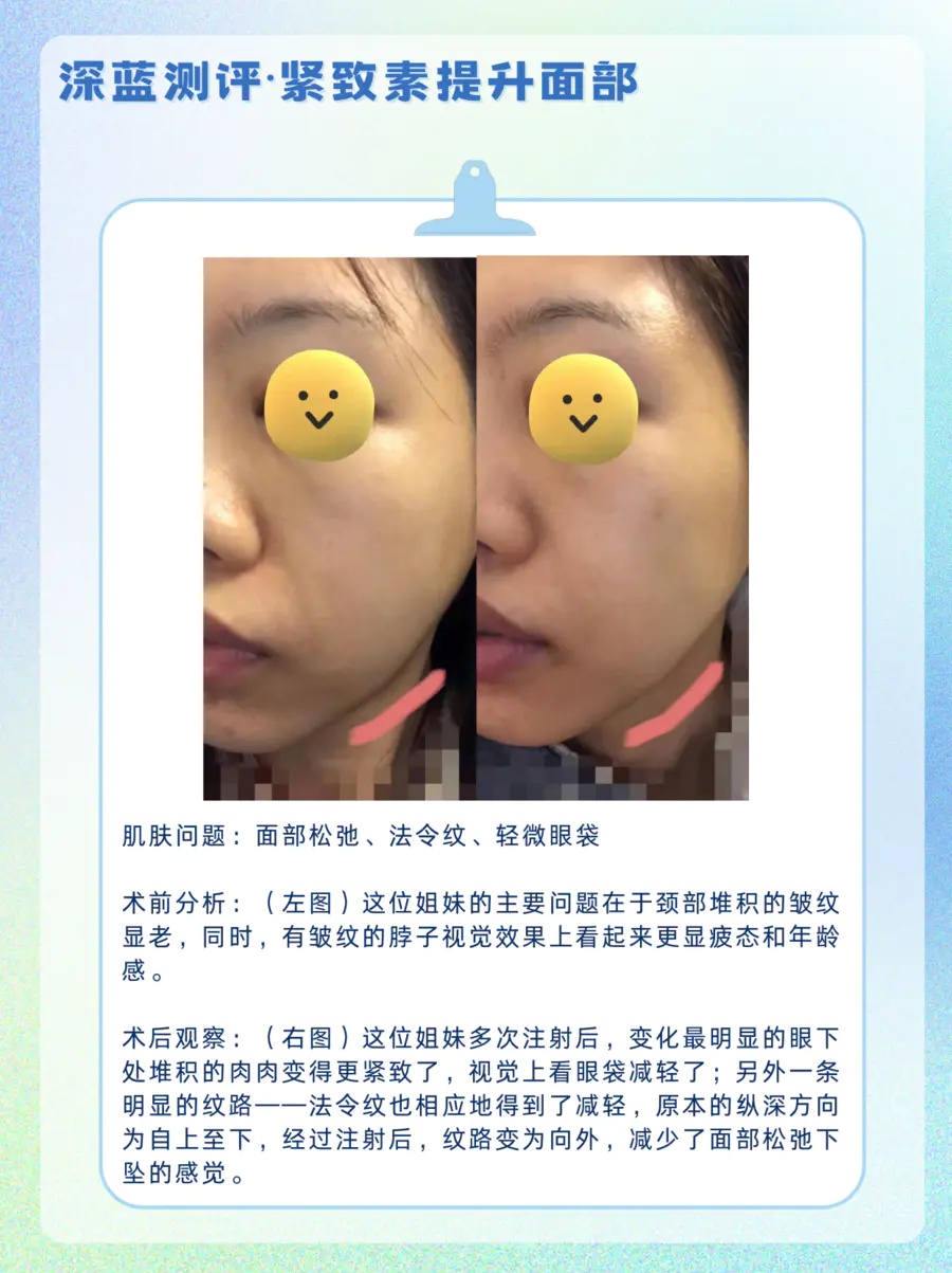 紧致素在注射抗衰上还是有两把刷子的,本期测评分分为姑娘们比较关心的4个部分的松弛度改善:眼周细纹组、法令纹组、颈纹组、面部提升组。