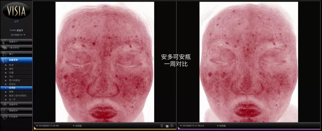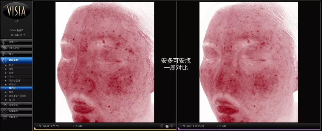 可以很明显的看到整体的泛红减少了很多,而且激光术后的痕迹也有淡掉很多。