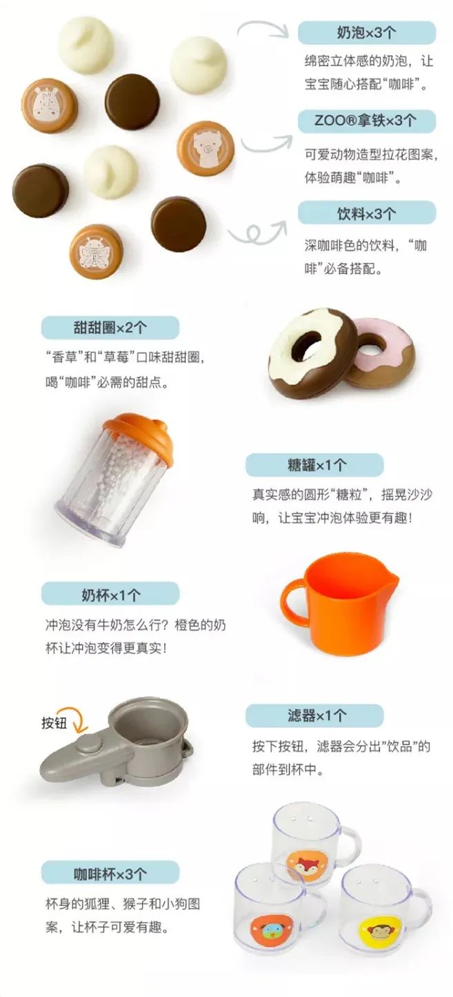 激发宝宝创造力,通过饮品配方的组合,能让孩子创造出三种经典咖啡,同时学习道具间组合的因果关系,对于更具创造力的宝宝,试试看“半糖去冰”?