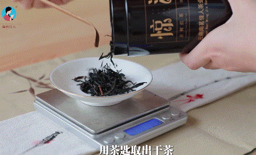 从装着《惊鸿》的罐子中,取出干茶,用电子秤称取5克。