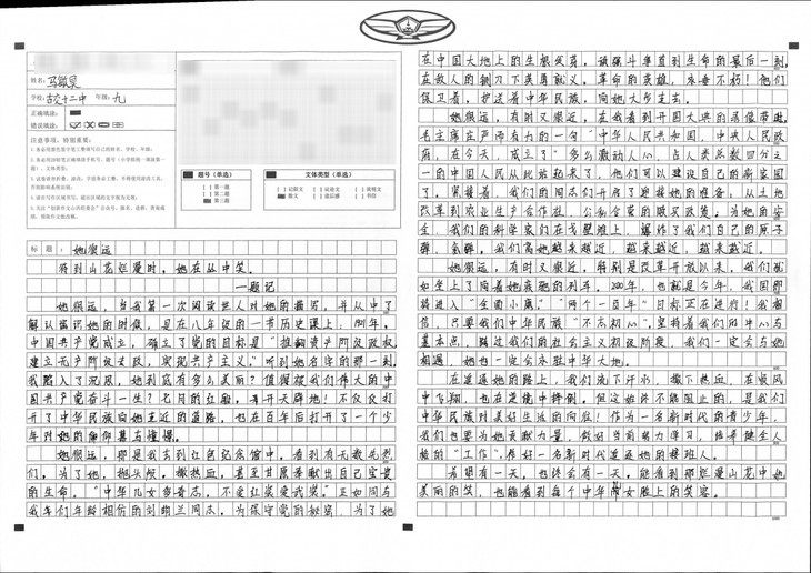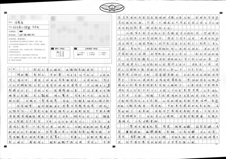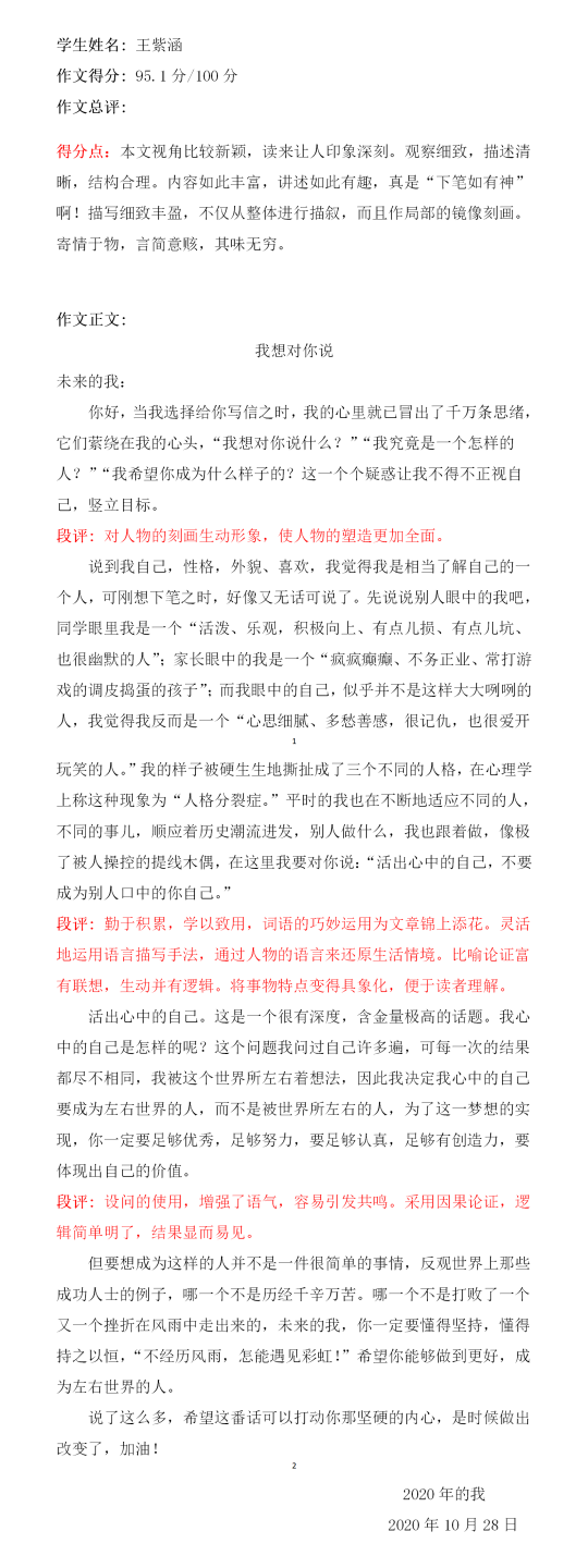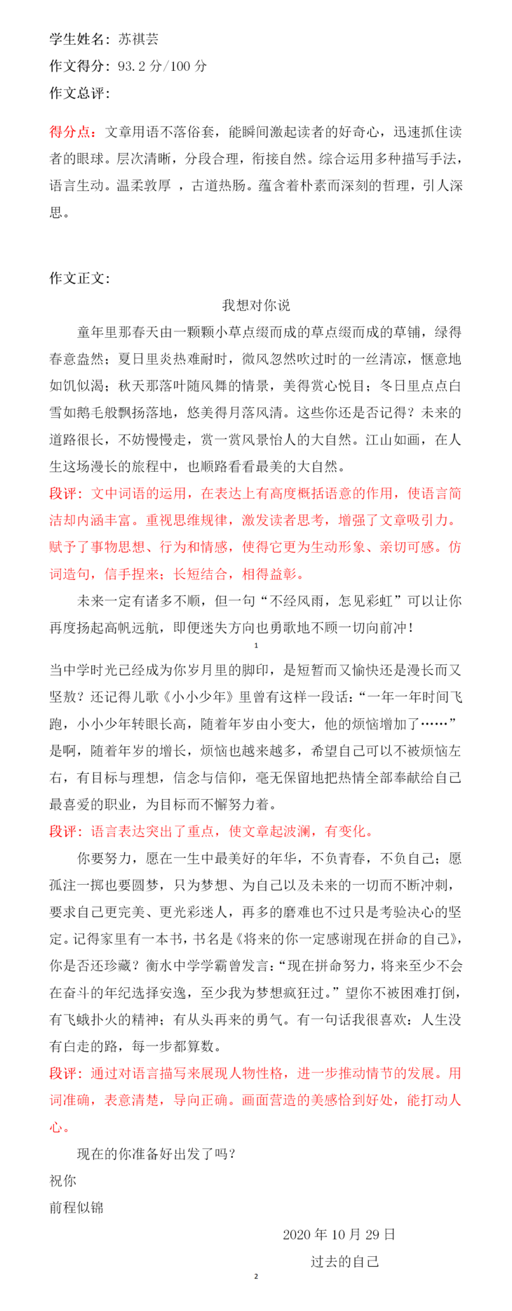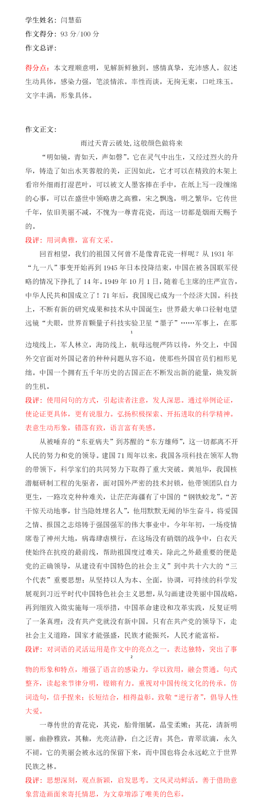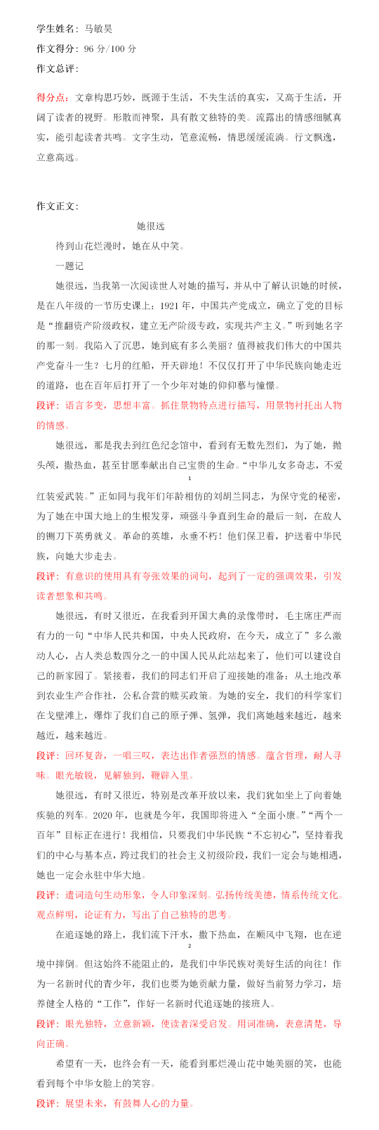 通过本片文章,我认识到了一个眼界开阔、有着宏大的世界观、强烈社会责任感和使命感的马敏昊同学,这篇文章从中国共产党成立开始写起,直到今年决胜全面建成小康社会,气势宏大、场面开阔、选材新颖、立意独特,希望他在今后学习生活中更加努力,在明年中考中创造属于自己的辉煌!