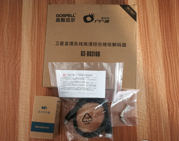 高斯贝尔户户通套餐,包含机顶盒、北斗高频头、高清线、F头、不干胶标签。