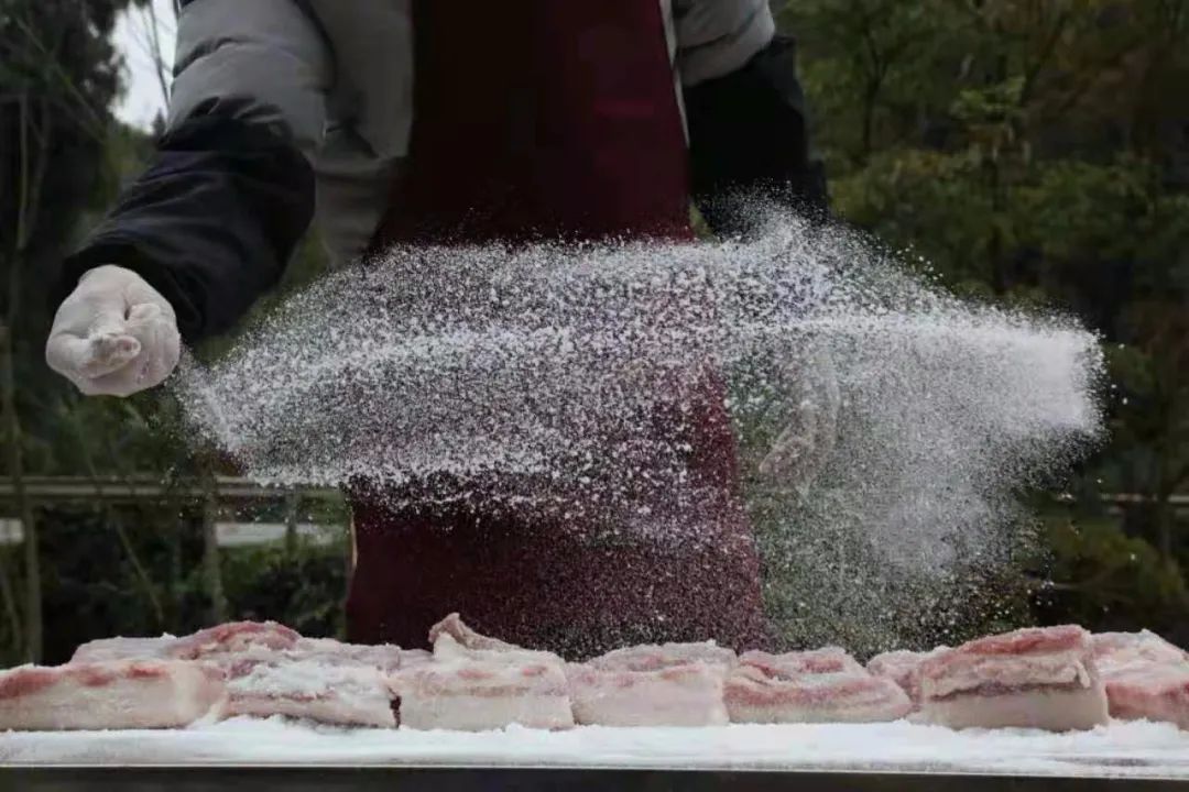 首先将现宰杀的土猪鲜肉按照不同部位,砍成8-10斤不等的长条,然后将猪肉放在一个大盆里,一块一块的抹上一层食用盐。将抹好食用盐的肉,放在大缸里,一层一层的码好。