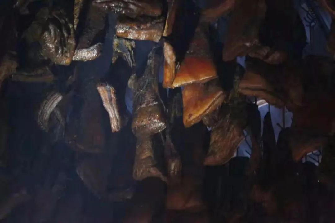 每隔几个小时,就要检查一下火,要保证火塘24小时不熄火,连续熏制20-30天左右,一炕上好的土家腊肉,才能出房。