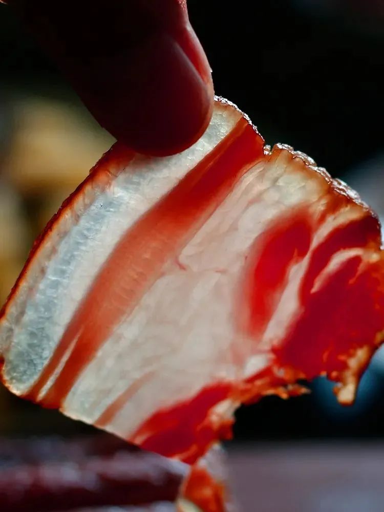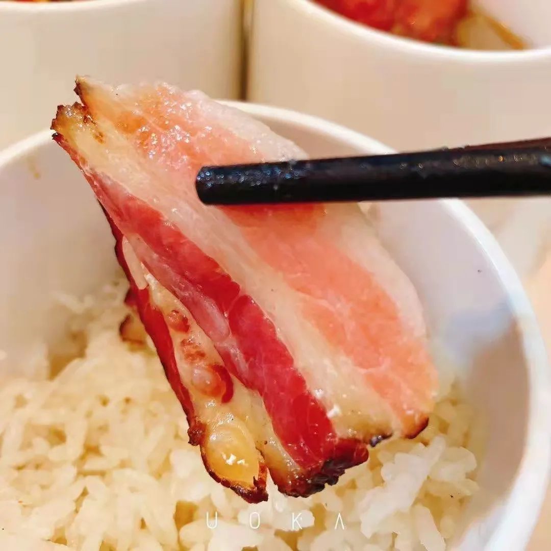 肥肉与瘦肉各执一层,红白相间,片片分明,瘦而不柴、肥而不腻,口感实中带嫩,有嚼劲,极适合用来翻炒、烹煮腊味饭。