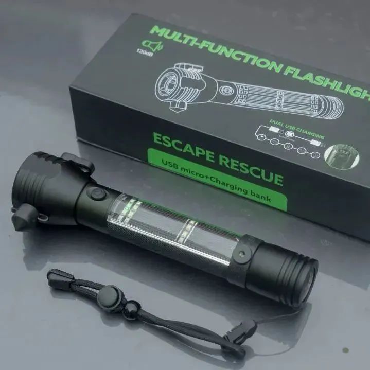 2、T6级大灯珠手电筒,升级侧面探照灯+警示灯充电宝+指南针+警报器多重功能,用途广泛;