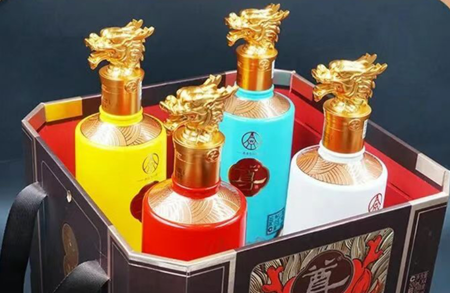 箱内四瓶酒对应帝王黄、中国红、天际白、松石绿四色🌈,分别寓意飞黄腾达、鸿运当头、寿与天齐、福禄亨通,好彩头拉满~