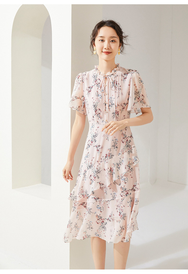 面料里料均为桑蚕丝面料,凉爽透气亲肤。桑蚕丝喇叭袖与裙摆灵动飘逸,木耳边领装饰精致钉珠,优雅气质。收腰修身的版型遮肉显瘦不挑人。