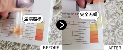 我们提取出使用魔盒前后被子上的灰尘,做为一个对照组,互相用试纸测试后得出:螨虫量从100h直降为0!