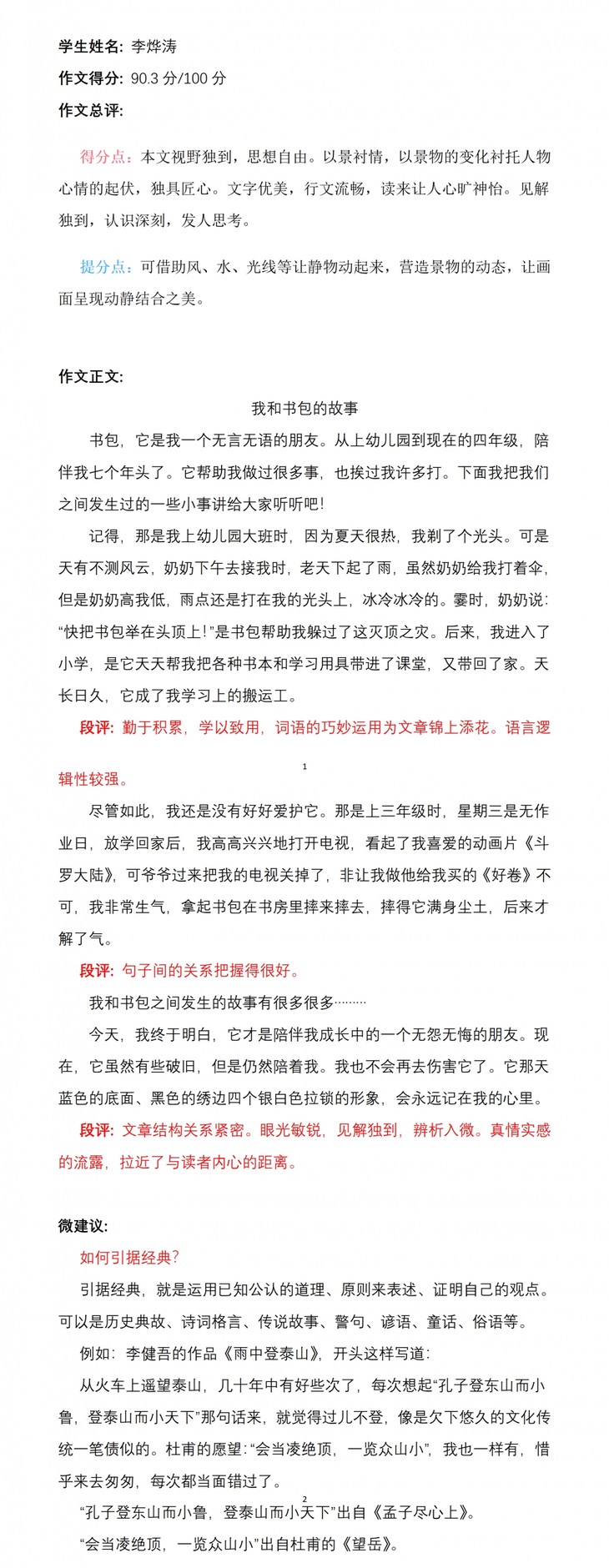 读完李烨涛同学《我和书包的故事》,让人眼前一亮。你善于思考的发现,独特的构思,精心的安排,使文章锦上添花。