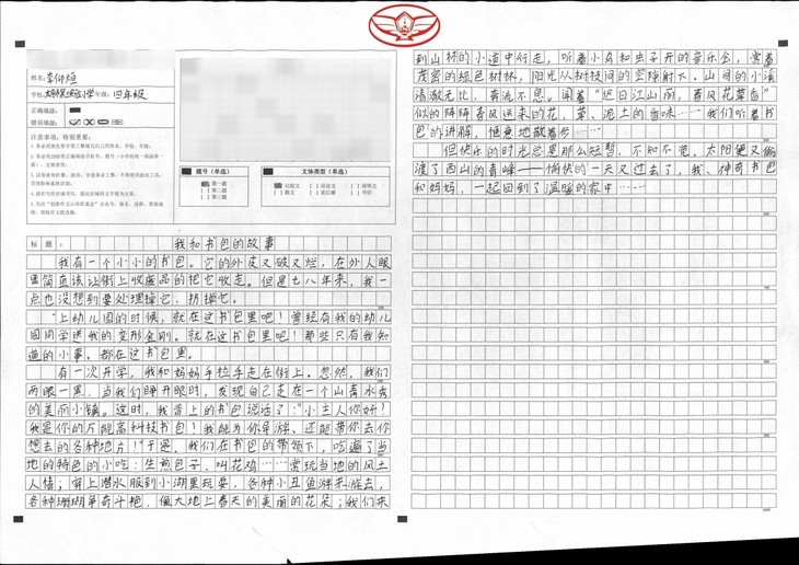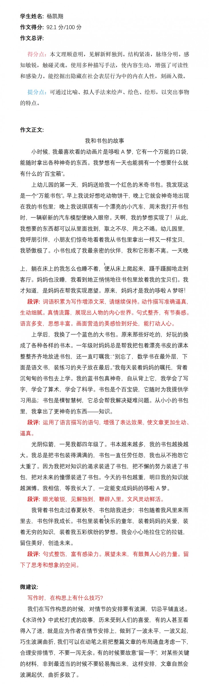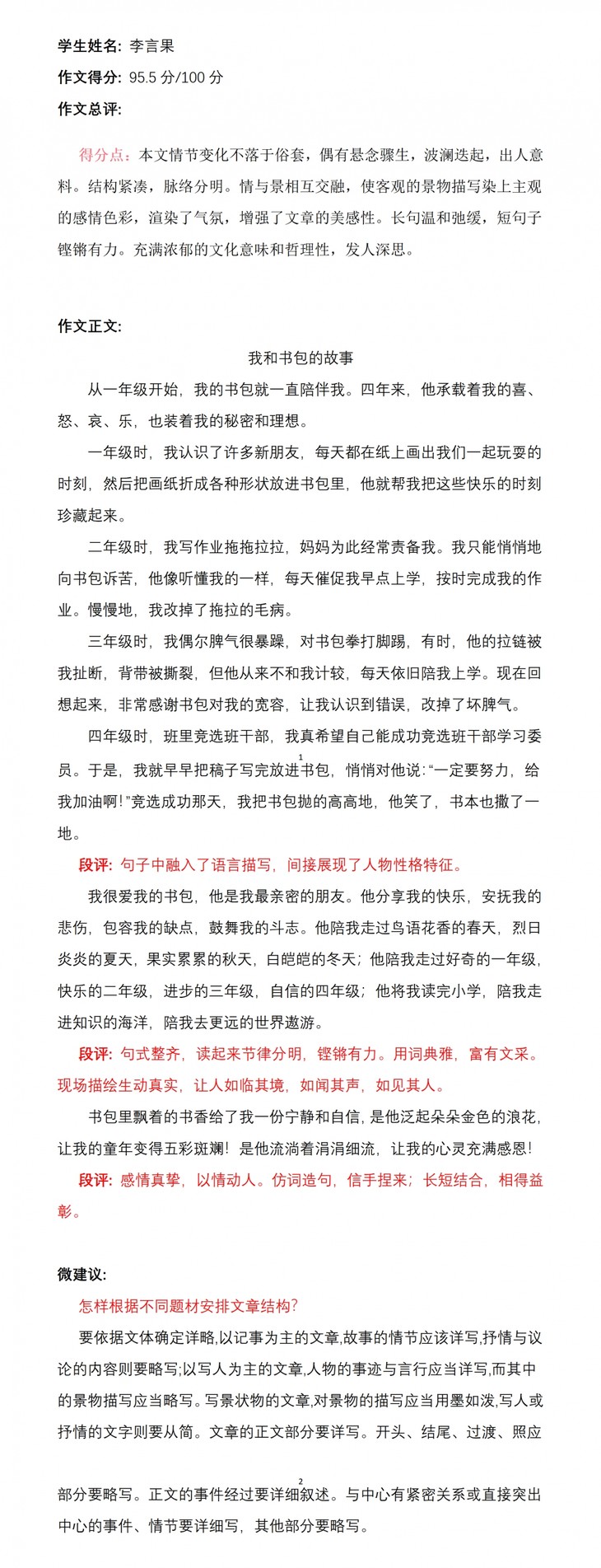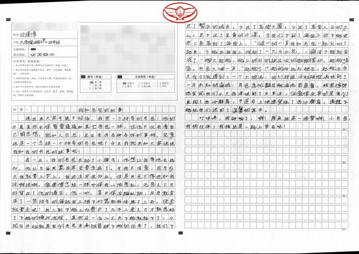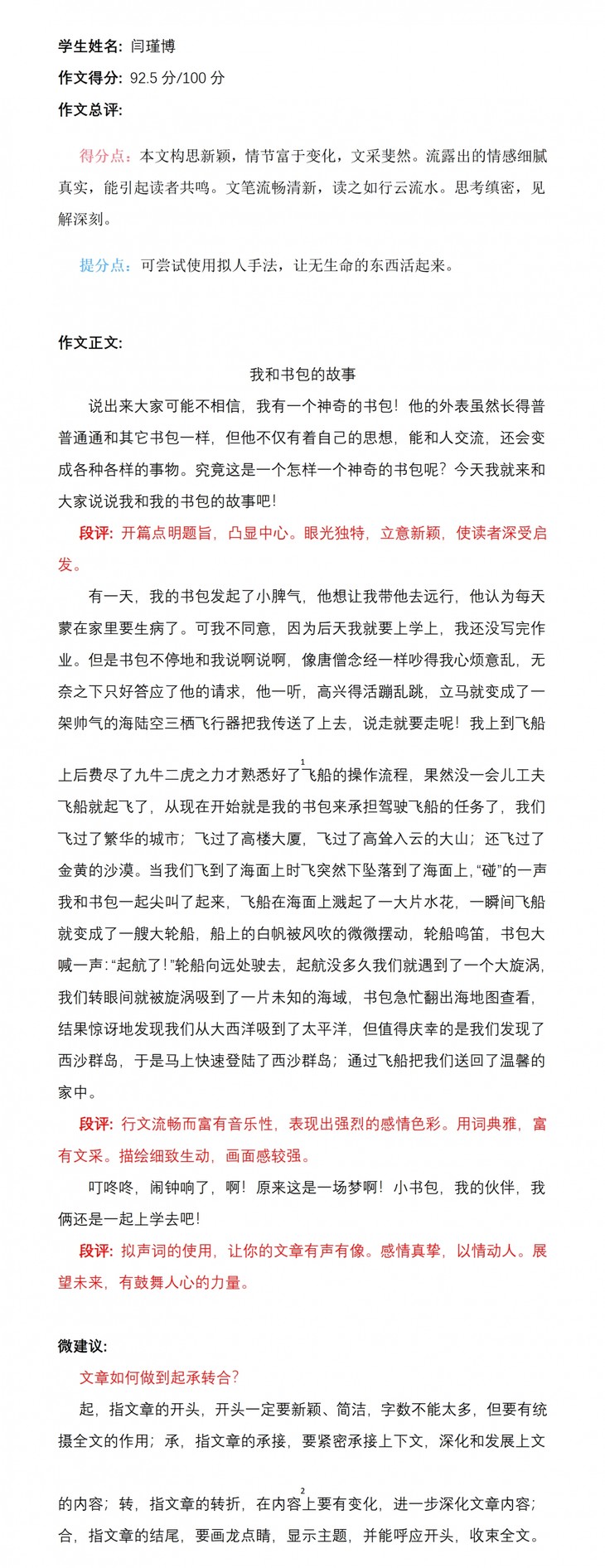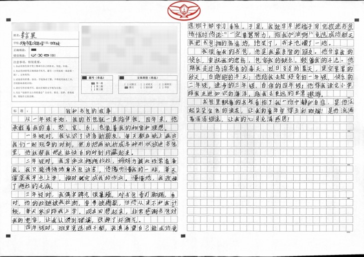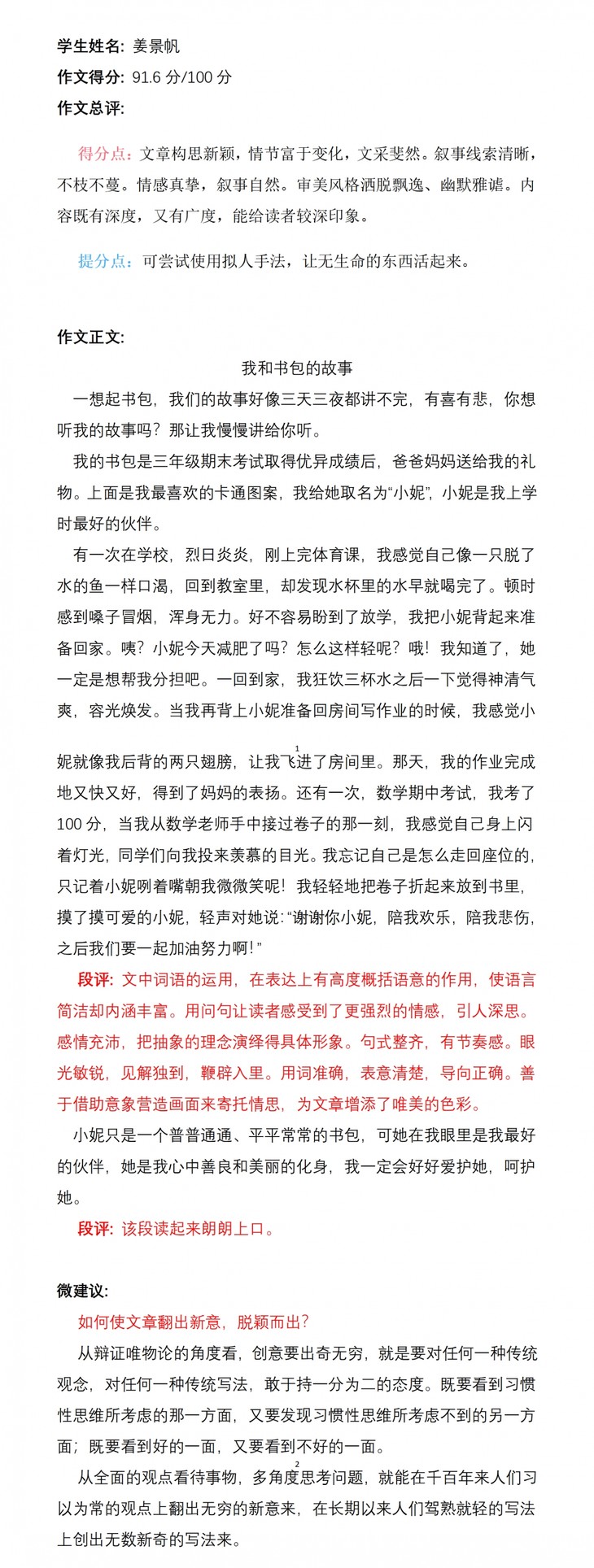 一个小小的书包里,装满了历史故事,装满了对未来的想象。语言是那么生动,感情那么丰富,每个字都呈现出小作者的真情实感。给读者留下了深刻的影响,希望你能有更多这样的作品,让自己更优秀!