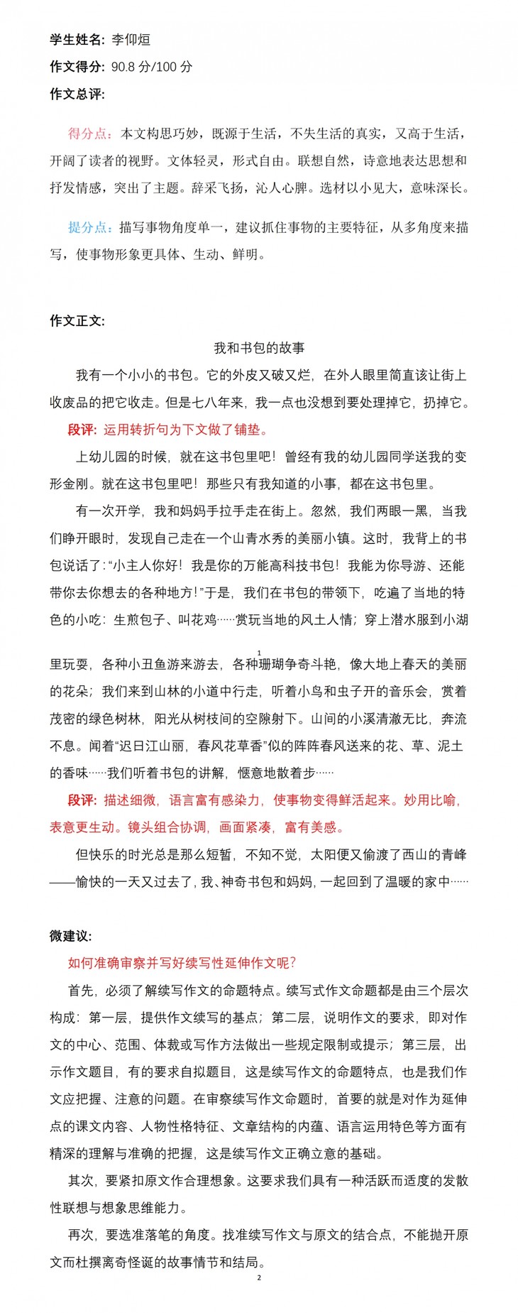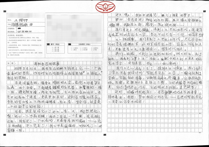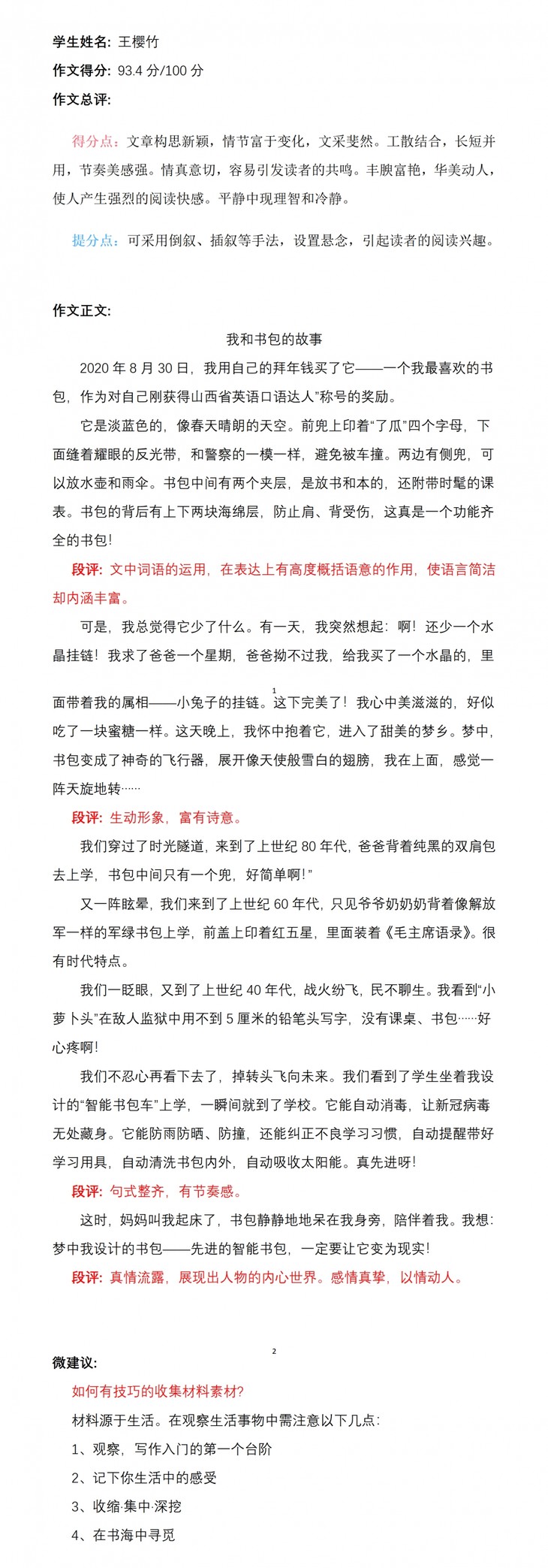 好文章来源于生活,文章里祖孙三代人的书包故事就真实反映了不同时代的时代特征,这些都与生活密不可分。我们希望王樱竹在日后的学习中能够多“观察生活,倾听生活,思考生活,书写生活”!让这次写作大赛成为你更加努力写作的契机,今后佳作频出!