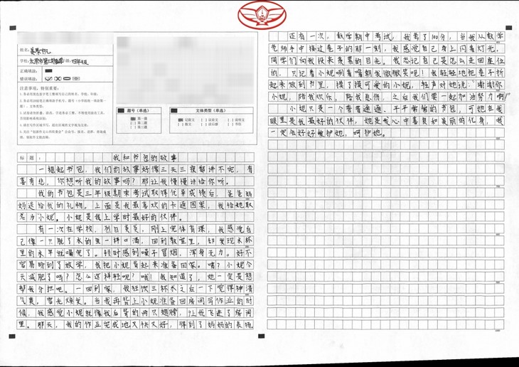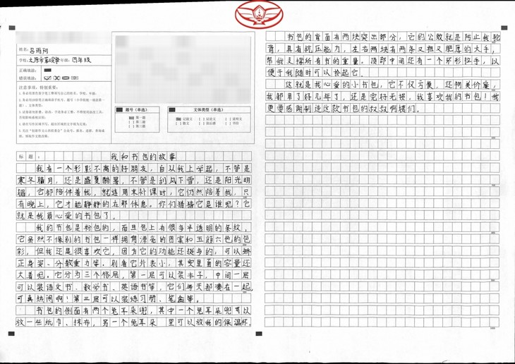 当我看到题目时,我首先想到书包像我的一位朋友一样,无论雪雨风霜,无论春夏秋冬,每天都陪我上学,从一年级到四年级,书包见证了我的成长,所以,我把书包当成一位朋友来写,写的时候感觉很有感情,写起来也觉得得心应手。