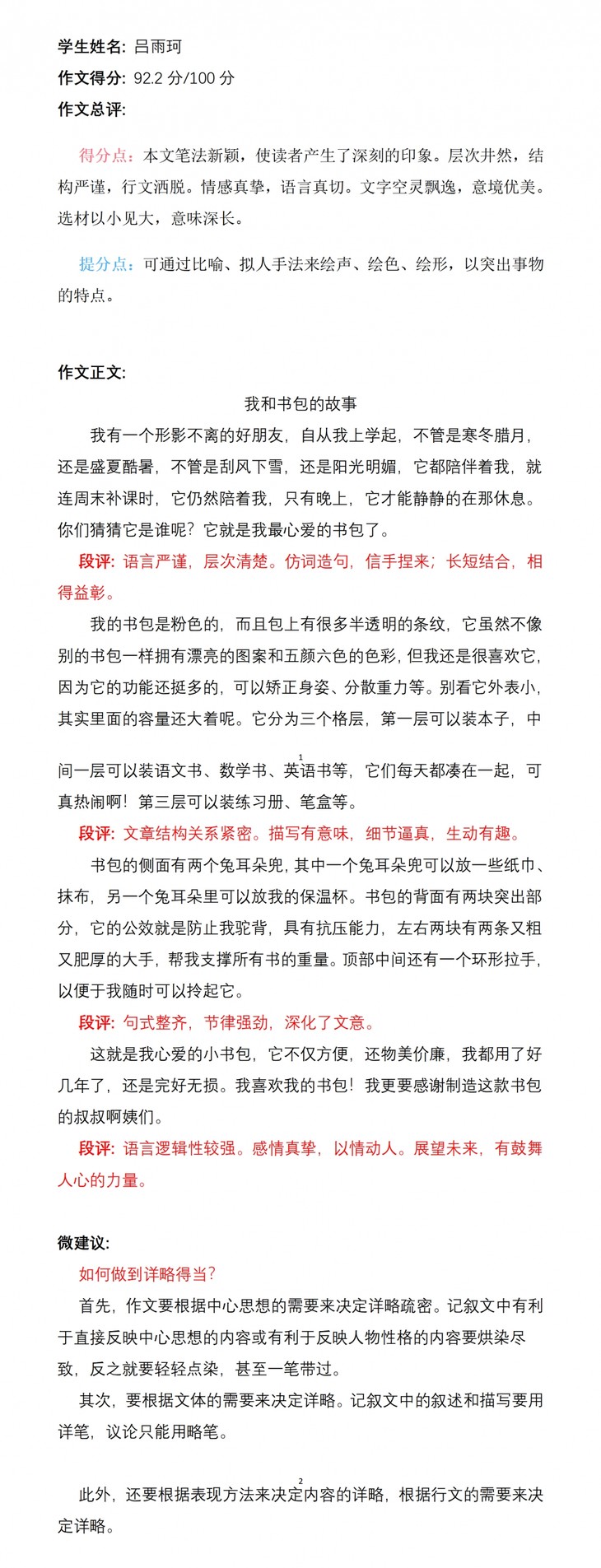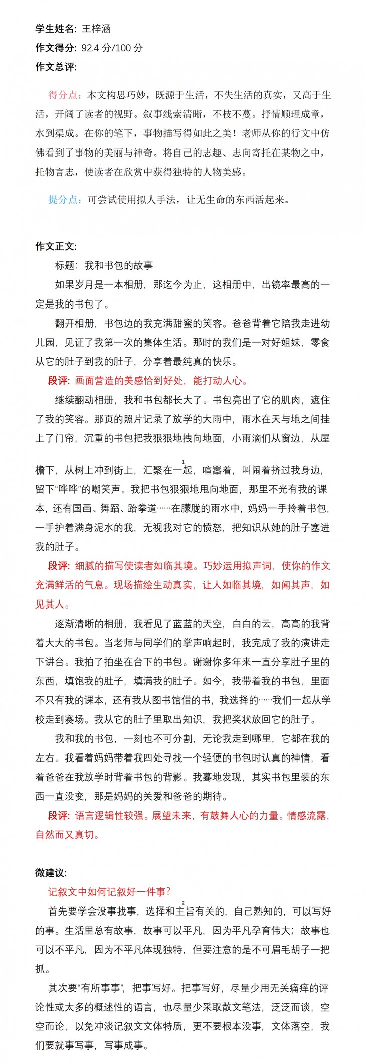 读书破万卷,下笔如有神。小作者通过平日的阅读与积累收获了写作上的不断进步。小作者的书包里藏着她的成长点滴,藏着她的喜怒哀乐,更藏着她与父母之间深深的爱!愿王梓涵同学能够继续努力,在写作的路上不断尝试,在成长的路上勇往直前!