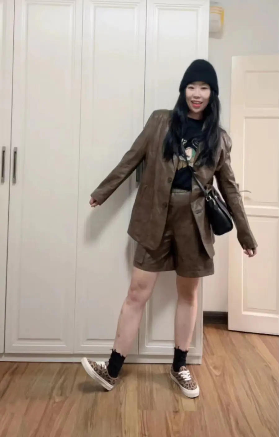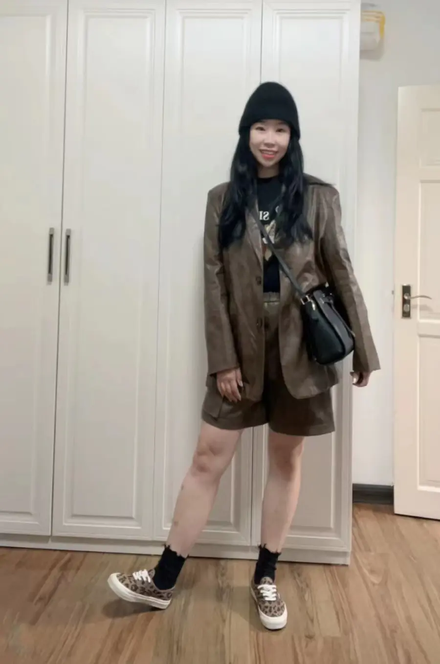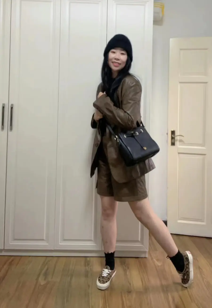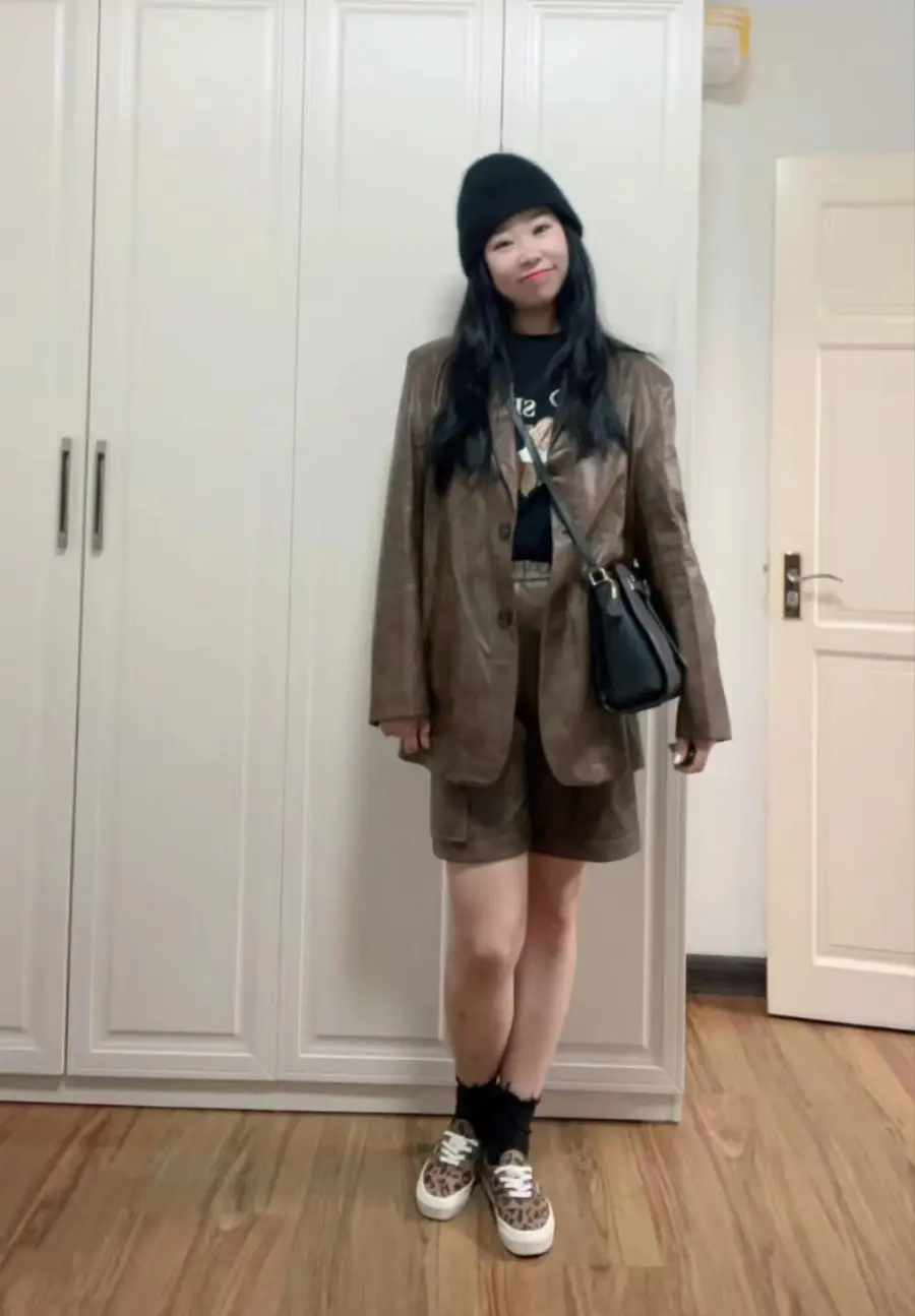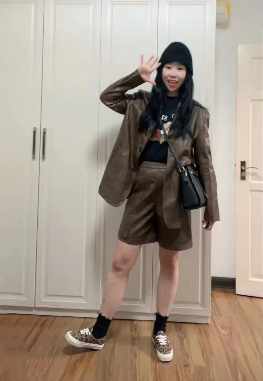 榛果棕皮衣套装又飒又舒适