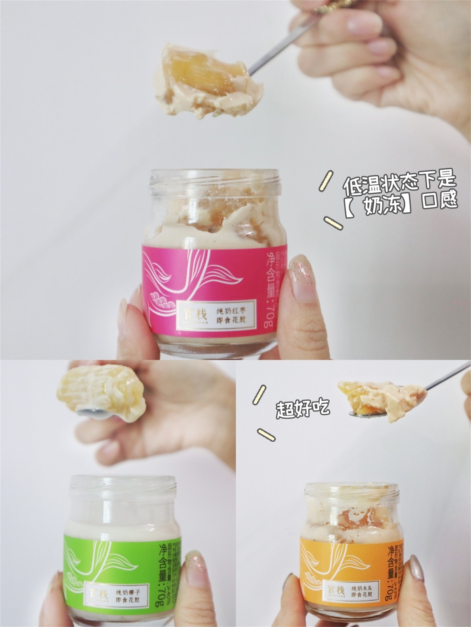 它不像炖花胶那样会有腥味,入口顺滑,吃起来嘴巴黏黏的,奶香味十足。一盒有三个不同的口味:红枣味、木瓜味、椰子味。每个口味我都喜欢,打开瓶子就可以看到满满的花胶,料特别多,因为是用专业的物理去腥技术,入口基本是无腥味,制作不加1滴水,只用纯奶鲜炖,低脂不长肉,补充胶原蛋白,最重要的是不添加任何的防腐剂,这点才是最放心的