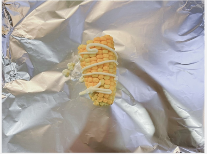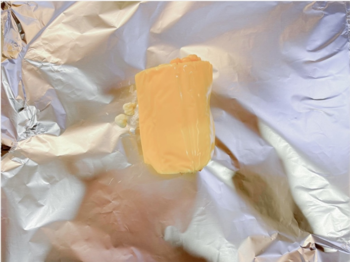 2、在桌面上铺一张锡纸,放上一块切好的玉米