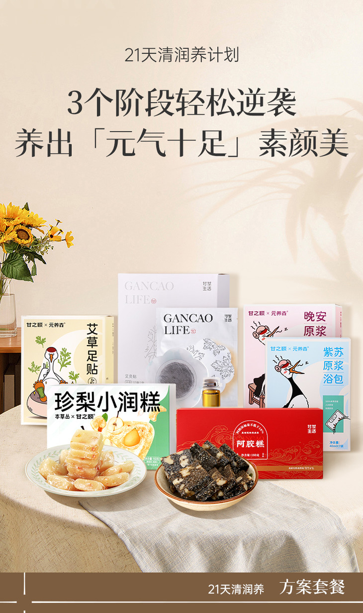 甘草生活「21天清润养套餐」包含6大产品,通过食、灸、泡、贴4大方式以21天为周期,通过清润养三步走,先把肺部通道打开,再去润和养,做到【清得干净,补得进去】,养肺强体质的同时,还能由内而外养出好状态。
