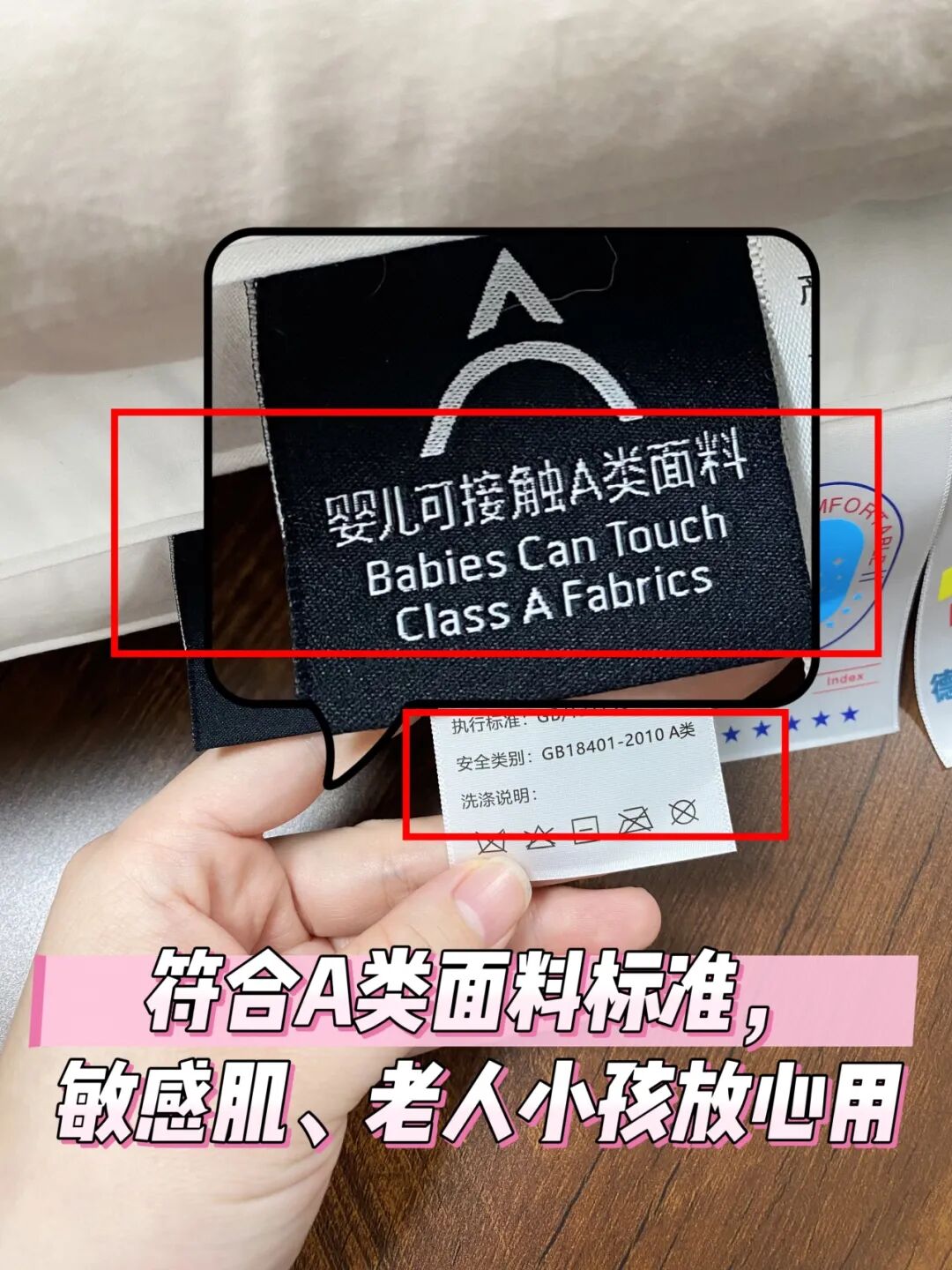 面料达到国家A类母婴标准,婴幼儿可直接接触,无甲醛、无荧光剂,家人们放心枕!