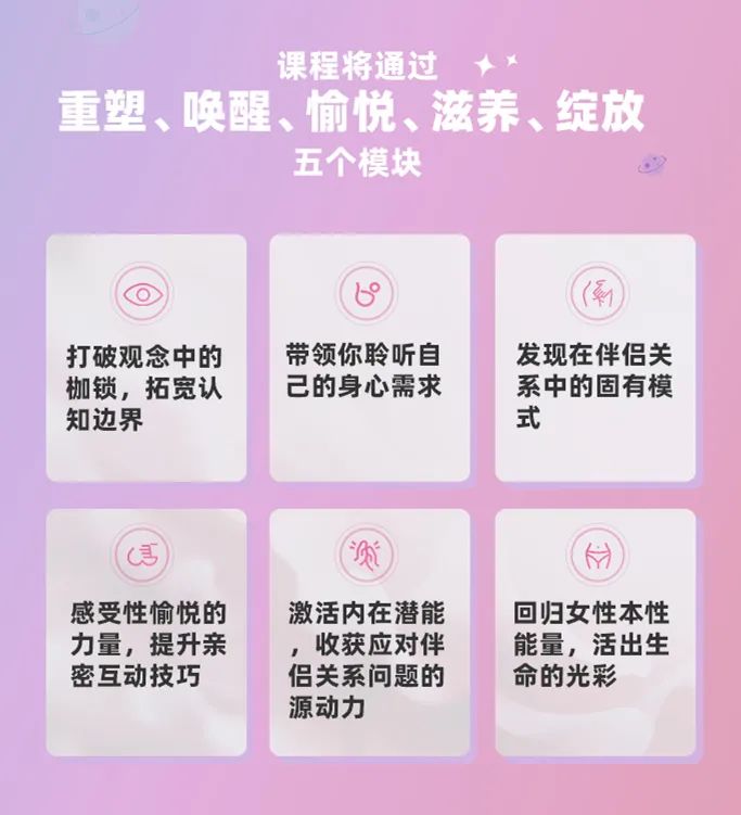 我们一开始是希望它能给姑娘们提供一个轻松,舒适、私密的环境,让大家能够大胆谈杏,提升两性技巧,享受闺房的乐趣,这一点也确实做到了,但其实我们课程所涵盖的内容却远不止这些。