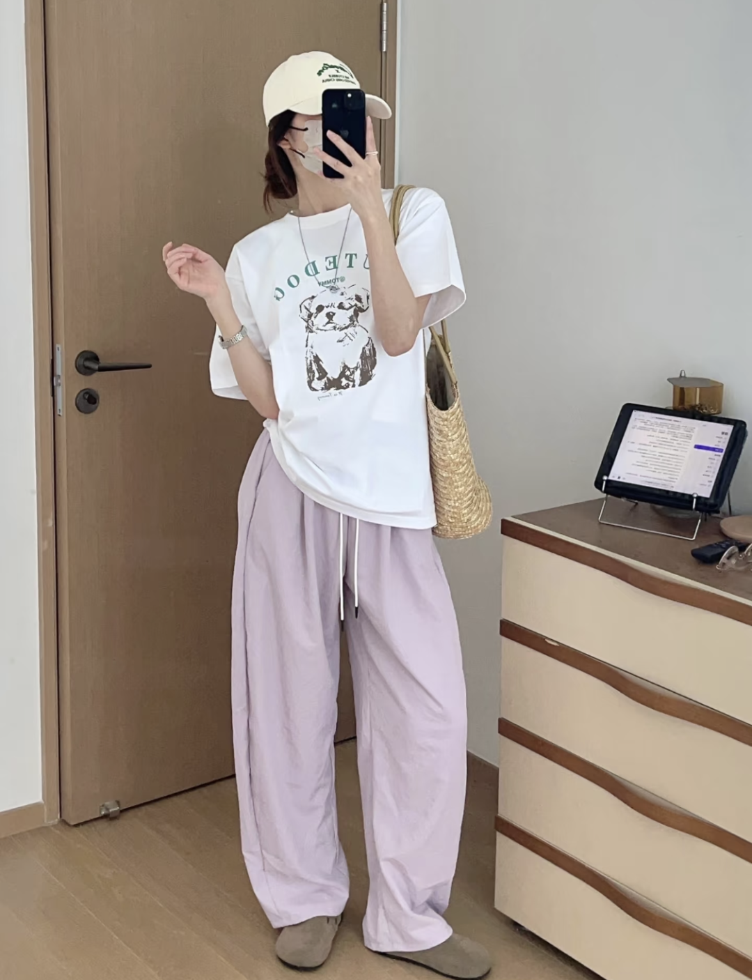 浅卡其色冰丝弯刀裤散发着复古文艺的气息,柔和的色调给人一种温暖、舒适的感觉。