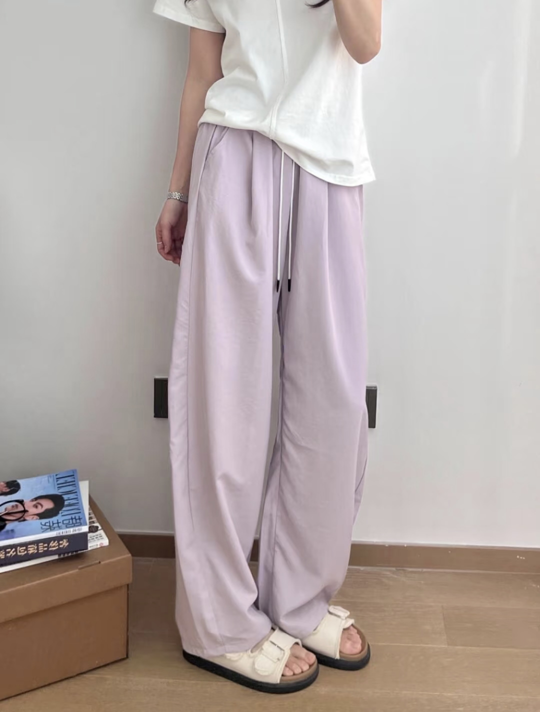 白色冰丝弯刀裤清新干净,给人一种清爽、纯洁的感觉。搭配简约的白色上衣和勃肯鞋,整体造型干净利落,展现出法式优雅的气质
