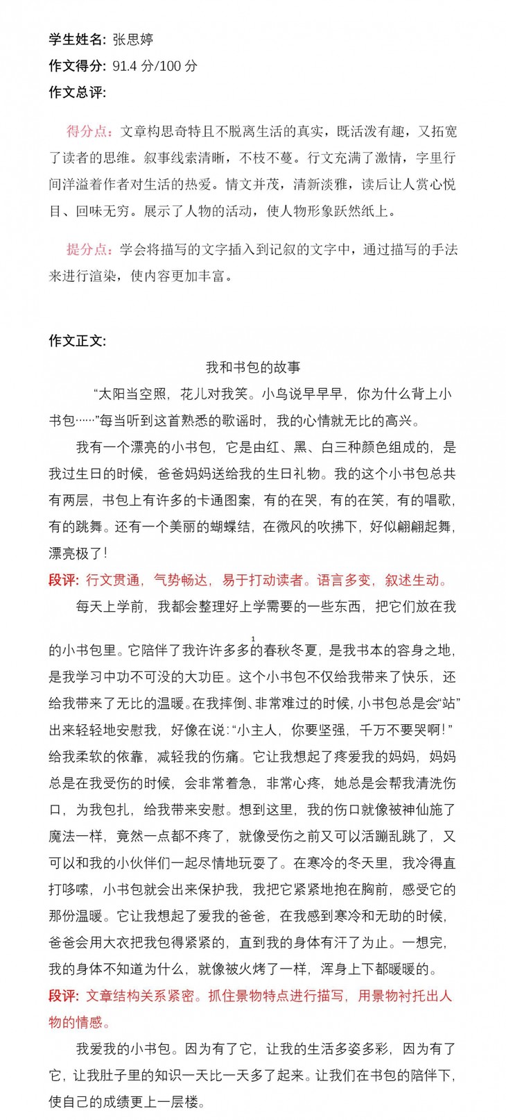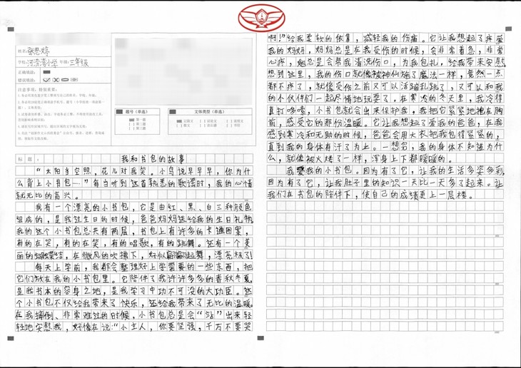 文章开头以歌曲引入,吸引读者。细细读来充满了真情实感。书包是你学习生涯的大功臣。你难过时,安慰你;你寒冷时,温暖你……有了它,你的生活多姿多彩,心情愉悦。你是生活的有心人,你用真情打动他人,读你的文章真是一种享受。希望稳中求进,继续努力!