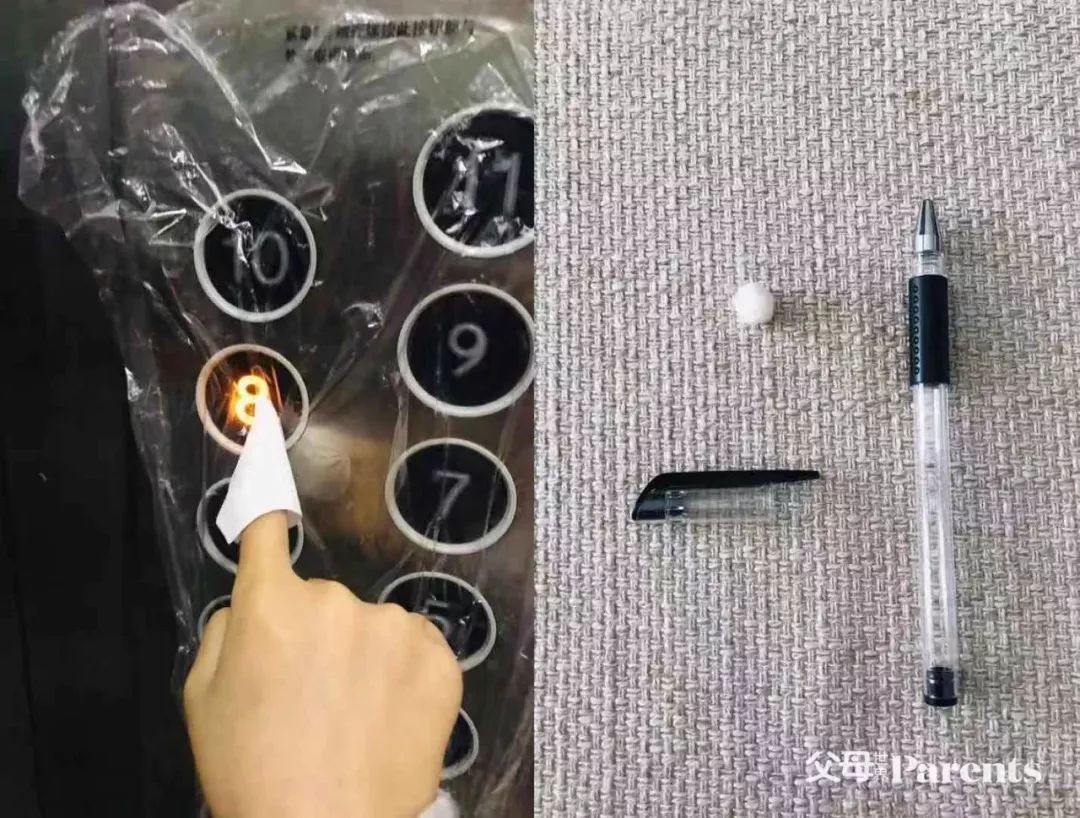● 找一支签字笔,去掉笔芯,把酒精球放入笔帽,再放入笔杆就做好小神器了。进入电梯的时候,拿出来拔下笔帽用无笔芯的笔轻触按钮,用完放回有酒精棉球的笔帽,可以消毒,反复使用、又环保;