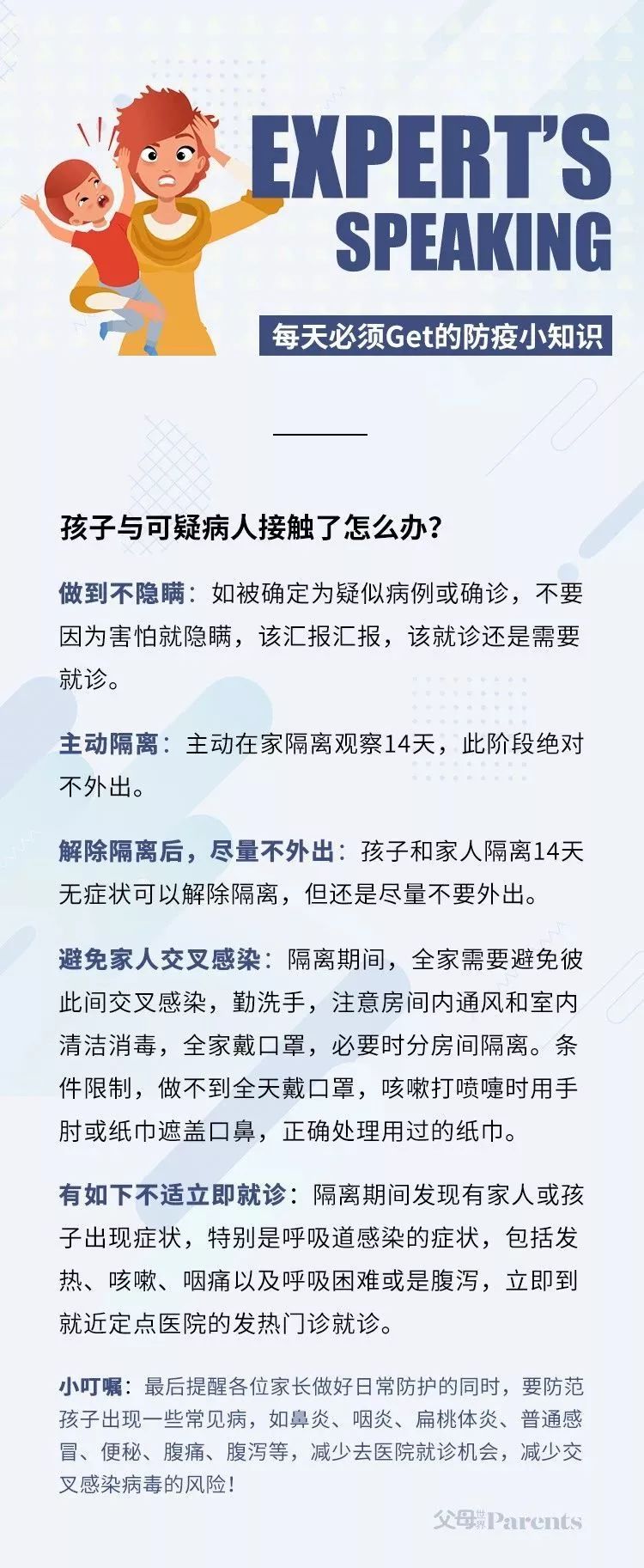 解答完上面那些纠结的问题,下面进入到我们的防疫小知识环节。如果孩子或家长与可疑病人接触了怎么办?