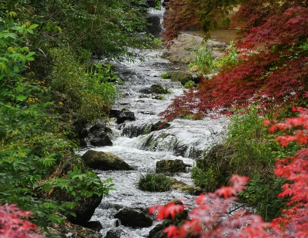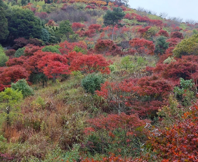 金黄的落叶铺满蜿蜒山路,清爽的空气沁人心脾,层林尽染的山峦宛如打翻的调色盘,每一步都仿佛踏入一幅流动的油画。