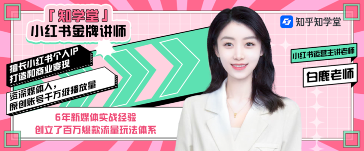「知学堂」小红书金牌讲师 擅长小红书个人IP打造和商业变现 资深媒体人,原创账号千万级播放量 6年新媒体实战经验,创立了百万爆款流量玩法体系