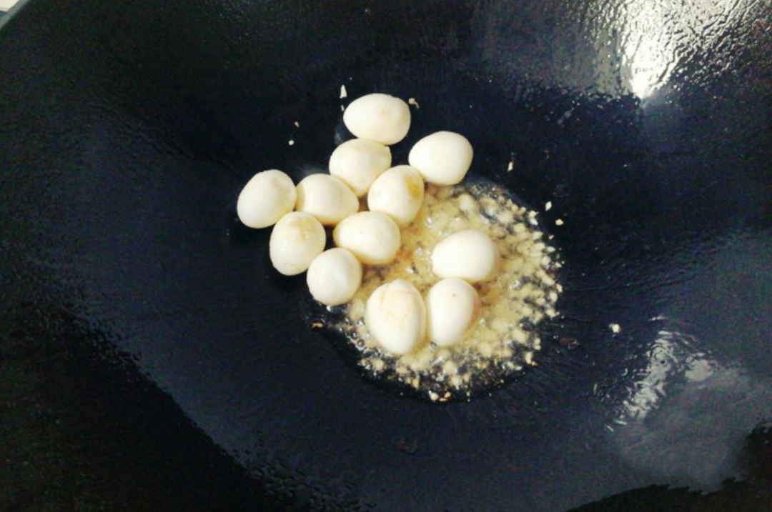 1、热锅凉油,葱姜蒜爆香,放入鹌鹑蛋翻炒,两勺酱油,1小捏白糖,1大捏花椒面;