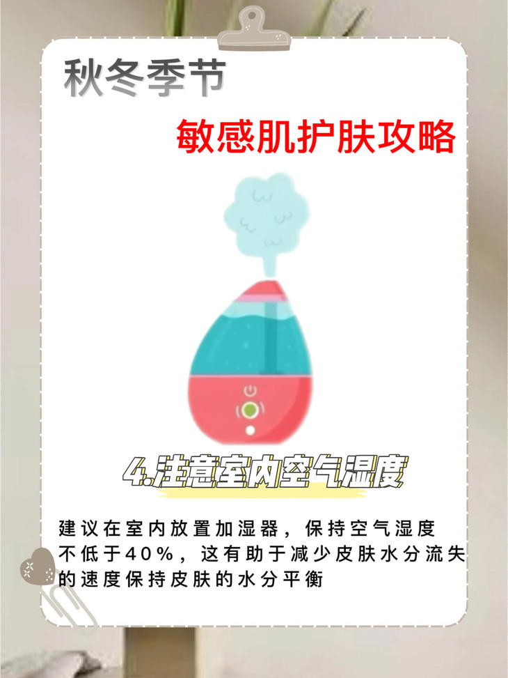 建议在室内放置加湿器,保持空气湿度不低于40%。这有助于减少皮肤水分流失的速度,保持皮肤的水分平衡
