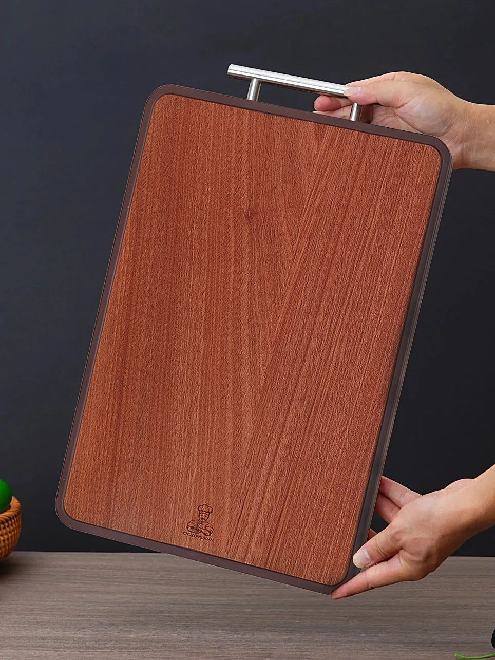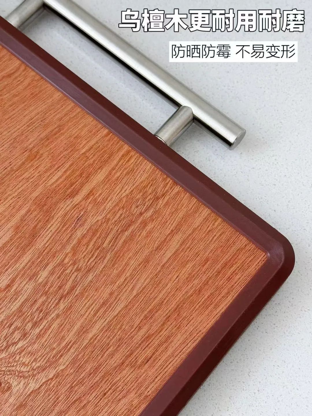 这款乌檀木双面菜板是双面加厚,一面是乌檀木,一面是316不锈钢材质,可以很好的实现生熟分离