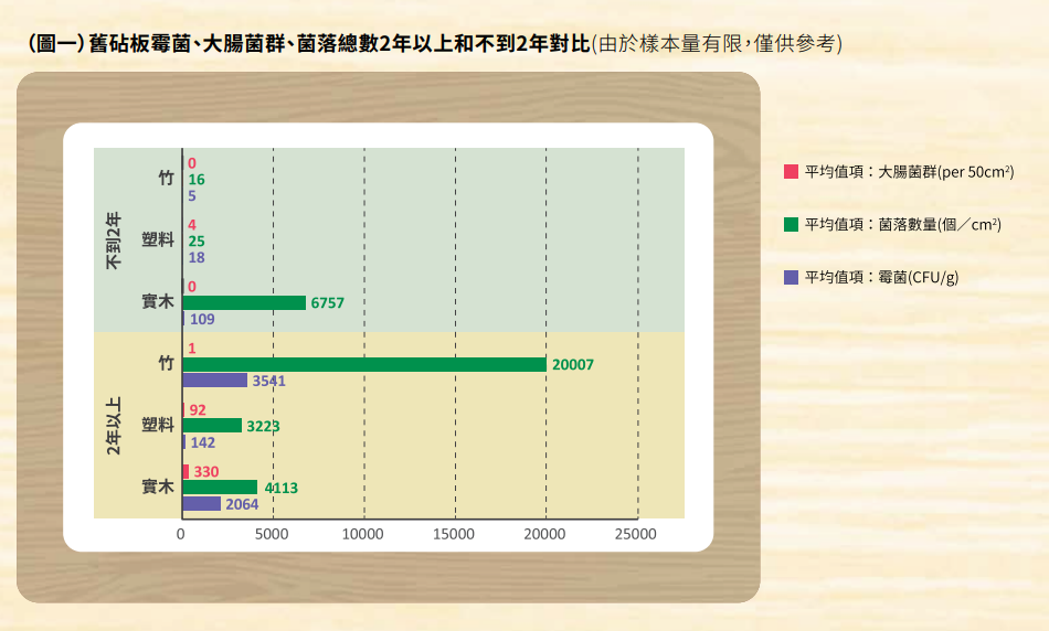 深圳消费者协会曾做过实验,使用超过两年的砧板,菌落总数超过 3000 cfu / cm²。