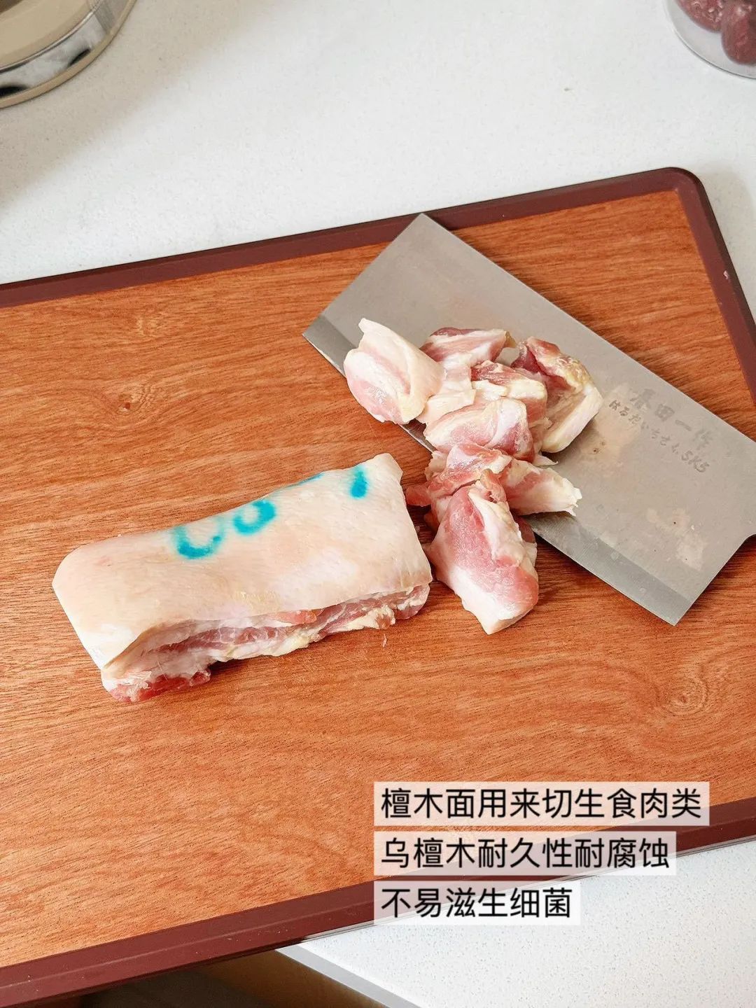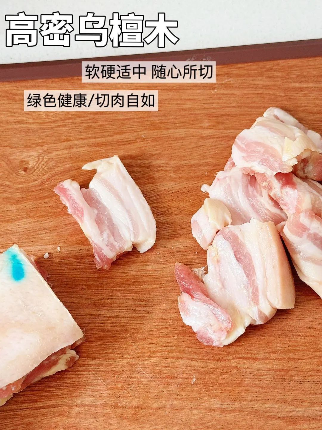 而且木纹细腻,木质坚硬、耐磨损,拿来切生鲜、剁骨头都不会破损
