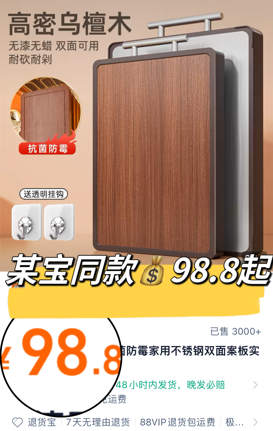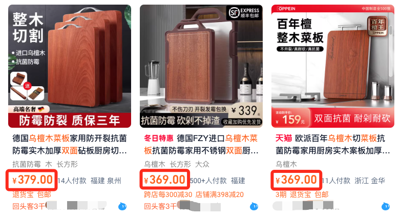 平常好一点的檀木菜板,在超市没有百元根本拿不下来,某宝同款卖到至少98.8/块