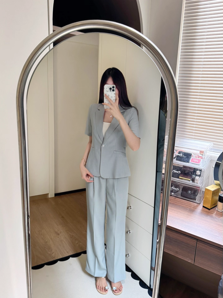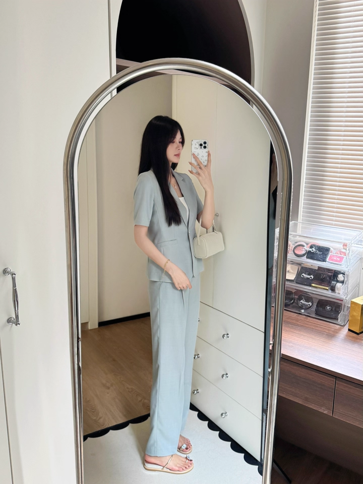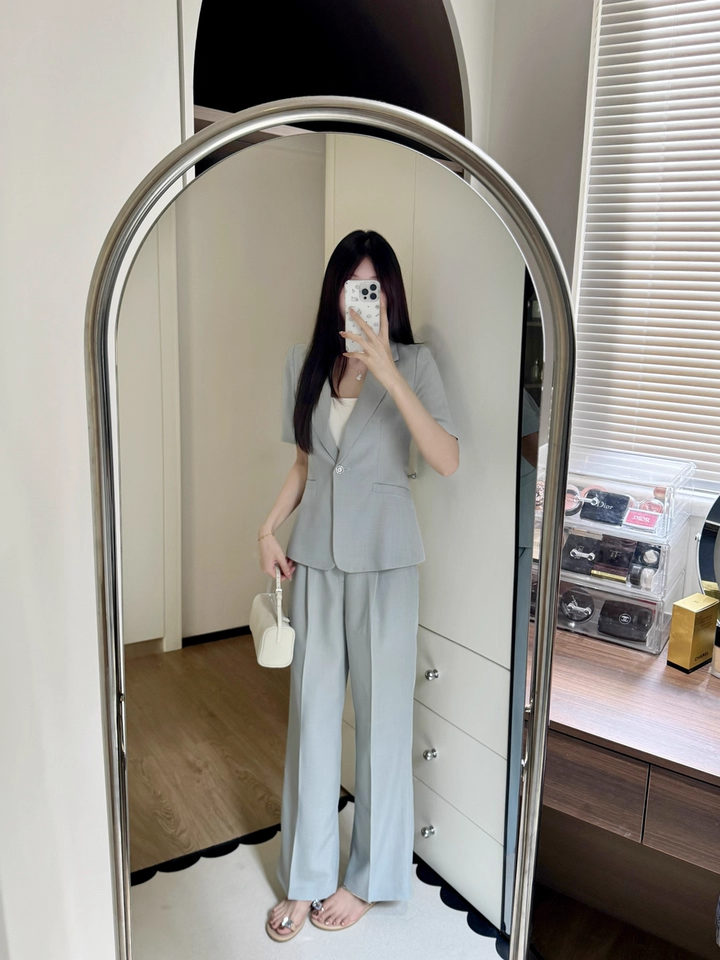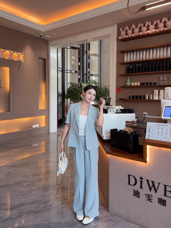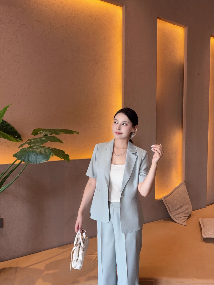 短款西装上衣,线条流畅,勾勒出女性柔美的肩部曲线,短袖设计又为整体增添了几分随性与洒脱。同色系的阔腿裤,是修饰身材的绝佳单品。