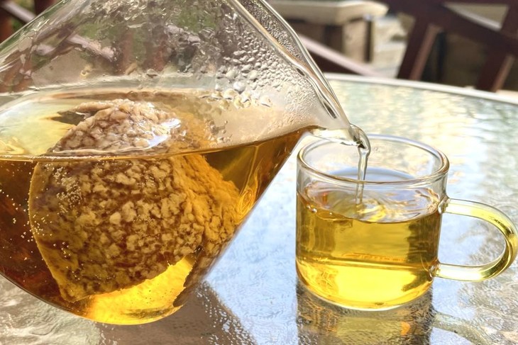 清洗一片(3瓣)新会陈皮,加入杯中煮沸泡茶,可见茶色金黄,柑香沁人。喝上一口,口感回甘回香。