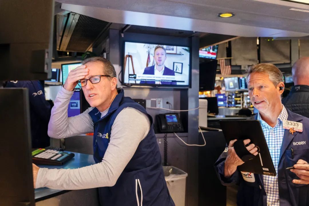 4月4日,纽约证券交易所的交易员们正在交易大厅忙碌。特朗普在 4 月初宣布“对等关税”后,道琼斯、标普500和纳斯达克等主要股指遭遇恐慌性暴跌