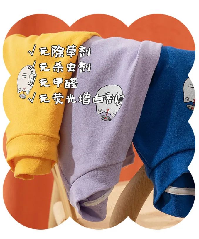 咕噜日记从棉花种植到纺织印染过程中都没有添加有害物质,比如除草剂、剧毒性杀虫剂、甲醛以及荧光增白剂等。