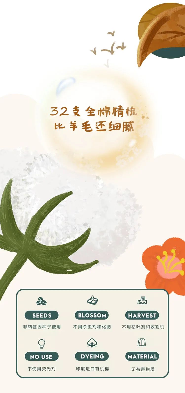 每一朵棉花都未经过任何化学试剂的漂染,无甲醛、无污染、无致癌芳香胺,只留有棉花的清香。