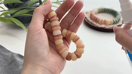 我们会把握品控,水准差的会直接剔除,最后再把合格的珠子手工一颗颗串连。