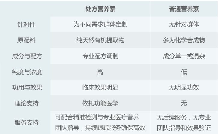 也称为功能性营养素,它提供给功能医学使用的医药级别营养补充剂。在美国是通过药物临床试验,保证精准的血药浓度在体内发挥作用,并且需要由专业的医生、临床营养师等开具处方购买的产品。医疗级别营养素所含有的特定的营养素成分,其剂量是以符合治疗需求为目的,所以在一般常规饮食中不容易摄取到相同的分量。