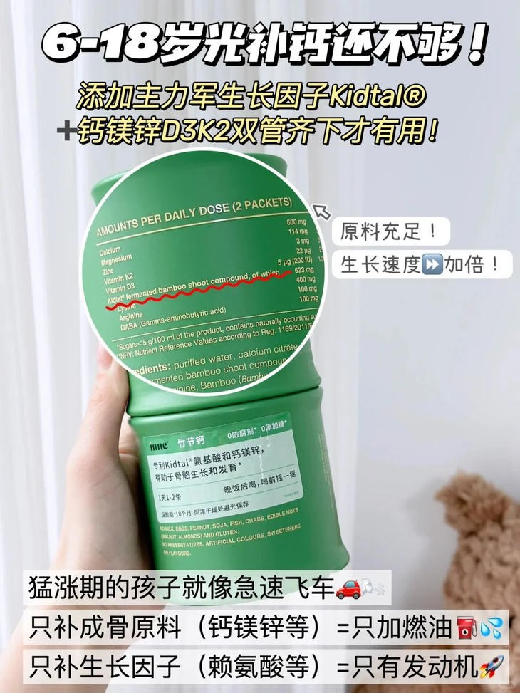 inne 家的新品竹节钙,多重营养配比,给到孩子足量成骨因子,还有独家 Kidtal® 赖氨酸配方,专为 6-18 岁儿童设计,一次性给孩子补到位!